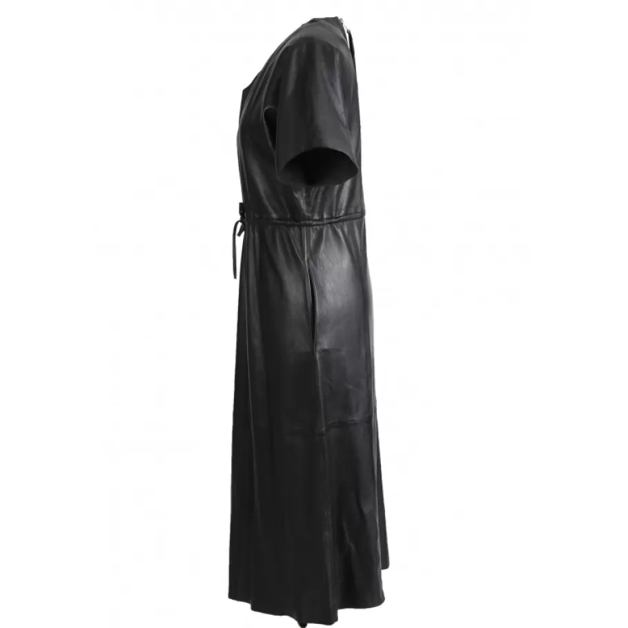 Matiere Fluide, Taille Marquee – Vous L’Avez Devine, Cette Robe Mi-Longue Est Un Must-Have ! Cuir Veritable De Mouton, Coupe Ajustee, Col Rond Avec Fente En V, Manches Courtes Chauve-Souris, Lien De Resserrage A La Taille, Poche En Biais, Fermeture Eclair A L’Arriere, Sans Doublure.